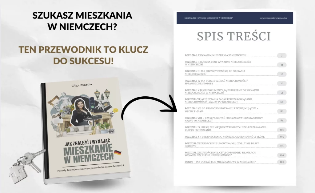 Rynek najmu w Niemczech jest wymagający, ale dobrze przygotowani kandydaci mają realne szanse. Właśnie dlatego powstała moja książka „Jak znaleźć i wynająć mieszkanie w Niemczech” – praktyczny przewodnik oparty na realnych doświadczeniach i setkach przeprowadzonych transakcji.